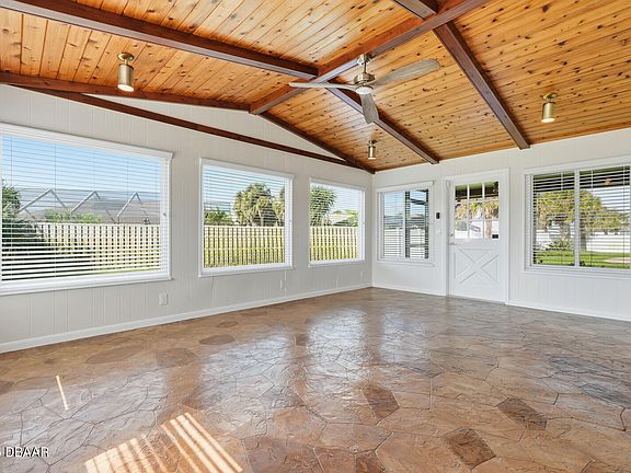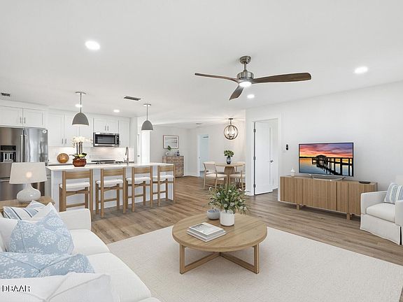 Welcome to Seabridge — an extraordinary and highly sought-after coastal community just steps from the sparkling sands of Ormond-by-the-Sea. This fully remodeled 3-bedroom, 2-bath home blends sophisticated design with relaxed beachside living. From the moment you arrive, you'll be captivated by the lush, manicured landscaping, freshly painted exterior, natural stone façade, painted driveway, and new roof that all contribute to stunning curb appeal. Inside, every detail has been thoughtfully curated with high-end finishes throughout. The open-concept kitchen serves as the heart of the home, featuring quartz countertops with striking waterfall edges, soft- close cabinetry, pendant lighting, and premium KitchenAid stainless steel appliances. The spacious primary suite offers a custom barn door entry to a spa-inspired bath with dual marble vanities, LED mirrors, and a frameless glass shower. Recent upgrades include a new roof, hurricane-rated garage door, energy-efficient hurricane-impact windows, new gutters, electric panel, and HVAC systems for comfort and reliability. Interior enhancements showcase solid wood doors, cedar closets, custom closet built-ins, luxury vinyl plank flooring, designer hardware, ceiling fans in every room, new washer and dryer, and epoxy-finished garage floors. Enjoy coastal breezes from the bright Florida room with a vaulted wood ceiling or unwind in the adjacent screened lanaiperfect for entertaining and relaxation. This turnkey coastal retreat has not been lived in since the remodel and offers the ultimate blend of modern luxury, thoughtful craftsmanship, and proximity to the Atlantic Ocean beach. Truly a must-see opportunity!