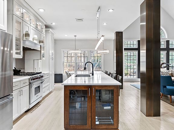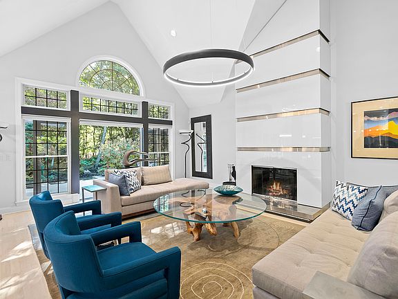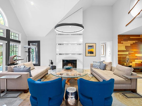 Located in the exclusive private waterfront community of Landfall in East Hampton is this 4 bedroom and 4 bath designer's own custom built home. This postmodern ranch is beautifully designed and made for easy living. It has an open floor plan with 17 ft high cathedral ceilings in the great room. There are large palladian windows throughout as well as sliding and French doors to maximize the natural light. Chef’s kitchen with custom cabinetry.