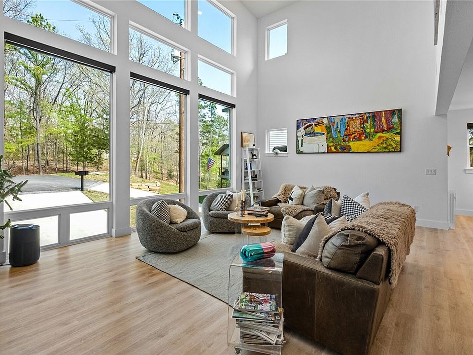 Where gorgeous modern comfort meets natural beauty. Professionally crafted in 2022 on over a half an acre sewered lot. This home features 3BR/3.5BA + office. Main level includes: floor to ceiling windows bringing in the natural light, eat in kitchen, Frigidaire Gallery appliances & quartz countertops. The main level has a bedroom, full bath, utility, double sided FP in living room/back balcony. Sliding french doors off DR open to covered deck with composite decking that help you take in the tranquil setting of this home & extend the entertaining. Upstairs features: main bedroom with walk-in closet & en-suite bathroom featuring walk-in shower, water closet, and double vanity. Second guest bedroom is also upstairs with full bathroom access from hall. Basement features garage, storage lockers, built in desk & plenty of storage along with added office. Metal Cowboy pool conveys, near Back 40 Biking Trails, & wood/chain link fenced in yard. Come see the high end custom finishes mixed with beautiful designer touches.
