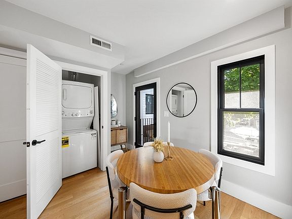 Nestled down a quiet street, this designer two bedroom, two and a half bedroom condo renovated in 2022 is not to be missed! Upon entrance you're greeted with a thoughtfully designed living space. The open-concept layout features a high-end kitchen with Samsung smart appliances, Milano gloss cabinetry, and striking Marquina Midnight quartz countertops and backsplash. Both bedrooms are located on the second floor and feature vaulted ceilings, generous closet space and an en-suit bathroom. Each bathroom is adorned with elegant designer tile, adding a polished, luxurious feel. A private deck off the primary bedroom provides a perfect space to unwind outdoors. This unit has roof rights! Enjoy the comfort of central HVAC with a Nest thermostat, in-unit laundry, and smart keypad entry for modern convenience. Just moments from Piers Park, the Shipyard, waterfront trails, and Maverick Station, this home offers the best of East Boston living.