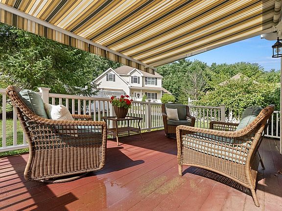 Stone Castle homes rarely come available in this desurable 55+ community of 89 homes. 2 story entry with warm hardwood floors throughout first-floor spaces. Upgraded finishes with 1st floor primary bedroom with vaulted ceiling accented by ceiling fan, walk-in closet and en-suite bath, complete with tiled shower and tub. Upgraded center island kitchen has newer appliances open to adjacent dining area. Step out onto private deck and enjoy greenspace under retractable sun awning. Relax in the full-sized family room, enhanced by power-operated window shades. Upstairs, you'll find another bedroom and bath, an office/library with built-ins, plus a large bonus room ideal for guests, hobbies, or exercise space. 2-car on-grade garage plus 2 car driveway, corner lot with enhanced private feeling. Upgraded with newer HVAC with on-demand hot water. Full basement walkout offers even more space or overflow storage. Pets OK. Community clubhouse. $569 monthly fee. Don't sacrifice space or amenities.