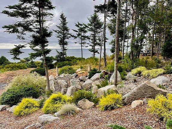 Large oceanfront propertyImmense natural beautyLandscaping of gardensPruned treesWood chipped pathsElevated upper areaSouth facing glass