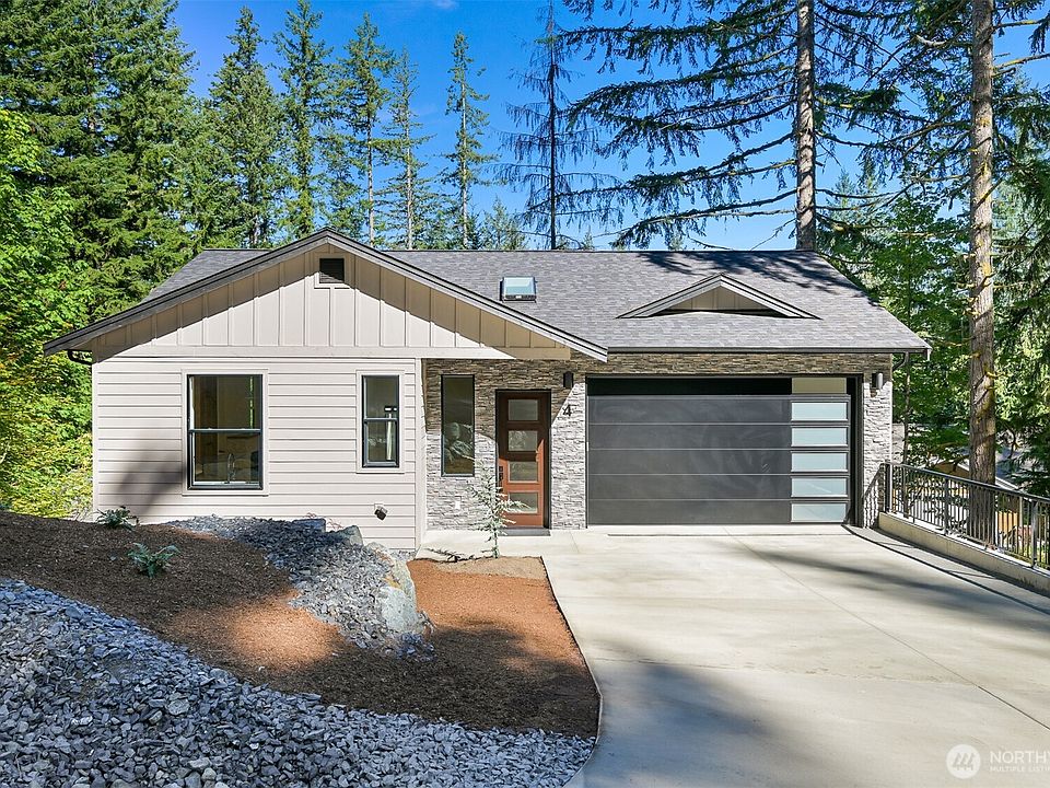 Brand new LUXURY in Sudden Valley! This designer home offers a level entry, primary on the main floor, vaulted ceilings, expansive windows, and a cozy gas fireplace. The modern kitchen features quartz counters, custom cabinetry, and stainless appliances. The primary suite provides a peaceful retreat with a walk-in tiled shower & great views. The lower level includes 4 bedrooms, another living room, and a 2nd fireplace. Enjoy decks on both levels overlooking the trees, perfect for entertaining or quiet mornings. Quality finishes, an open-concept design, and access to trails, lakes, golf, and more make this a rare find.
