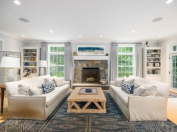 This exquisite shingle-style home, built in 2004 & updated in 2018, offers elegant country living on a secluded 6.5-acre lot with forest views. The residence showcases quality craftsmanship, detailed built-in cabinetry, and oversized windows that fill the space with natural light. At its heart is a gorgeous gourmet kitchen featuring two large islands with walnut and quartzite countertops, a large pantry, a wrap-around bar and seamless flow into the family & sunroom. The grand entry foyer opens to a formal dining room and a front-to-back living room, which also functions as a media room. Upstairs, the spacious primary suite boasts a cathedral ceiling, a window seat, double closets, and an ensuite bath, while three additional bedrooms, a bathroom, and a laundry room complete the second floor. The top level offers a private retreat with a large bedroom, a sleeping window seat, and a luxurious bathroom. The large level fenced backyard features a bluestone patio with a firepit and hot tub.