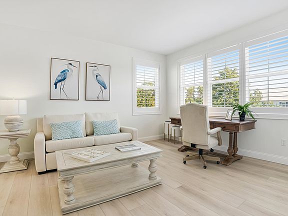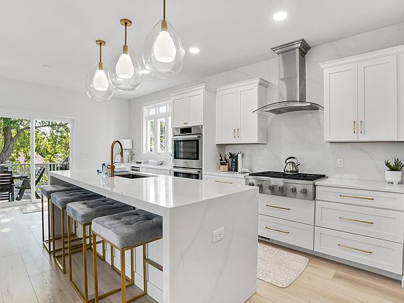Bright, open space with high ceilings & large windows. Ceiling-height quartz kitchen and counters, oversized mitered waterfall island, plantation shutters, lavish Coretec plank floors. Upgraded Bosch Stainless appliances,