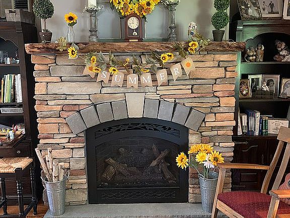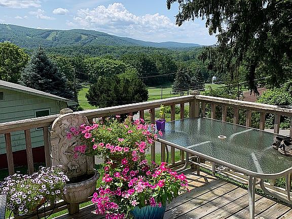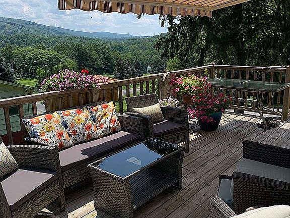 This split-level home features three bedrooms, one full and one half bath, an eat-in, updated kitchen, a living room with natural gas, stone fireplace, dining room, and family room. Other features include natural gas (hot water baseboard heat), hardwood floors, two- car garage, four-season room, and a wraparound deck with views.