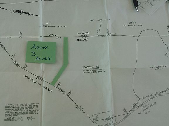 POND FRONT , 3 1/2 acres (or 4 acres ) of peace and quiet , if you enjoy nature and privacy , and are tired of neighbors then this is a no-brainer ,,surrounded approximately by ANOTHER 50 acres of privacy , this lot has NEVER been offered before ,, I don't think there's a better deal around ,, we just subdivided this lot on 11/4/16 from our 11.2 acre parcel , its now 84 Hooppole rd on the Falmouth/Mashpee line , you HAVE TO CHECK IT OUT ,508 564 6495