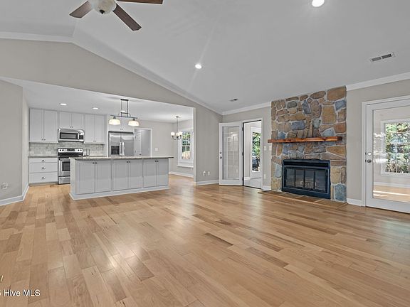 This beautifully renovated, one-level ranch is ideally located just minutes from Pinehurst Country Club and Lake Pinehurst, offering easy living in a peaceful cul-de-sac. The open floor plan seamlessly connects the living, dining, and kitchen areas, perfect for both everyday living and entertaining. This home also offers a versatile office (or den) and a bright sunroom that lead to the backyard, providing additional space for work or relaxation. The expansive front porch invites you to unwind and enjoy quiet afternoons. The kitchen features granite countertops, stainless steel appliances, a large island, and a cozy breakfast nook. Rich wood floors flow throughout the home, and a wood-burning fireplace adds charm to the living area. The two-car garage includes a workshop, offering ample space for storage and projects. The seller is offering a $10,000 allowance to be used for flooring repairs or as the buyer chooses.