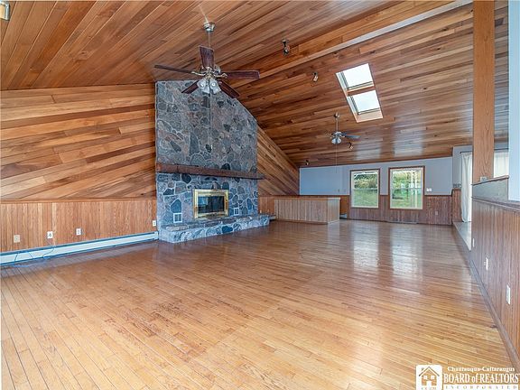 Gorgeous three-bedroom ranch-style home in Lakewood! Set on a neighborhood street with a peaceful suburban feel, this home is located in the Southwestern school district, just a short drive to the best shopping and dining around. The home offers an open floor plan and vaulted ceilings with skylights, bringing in warm, natural light. The wooden walls perfectly complement the hardwood floors and create a warm and inviting space to relax after a long day. The kitchen has an efficient layout and offers an island and a breakfast bar, in addition to a built-in desk that could serve as a coffee bar. The dining room is spacious and has two sliding glass doors onto the deck to simplify your summer barbecues. The living room is generously sized, yet warm and inviting, with a masonry fireplace and mantle. The three bedrooms are all on the main floor, and the master has a truly unique en-suite bath, featuring a double-sized jetted tub, a bidet, and a double vanity. The basement is partially finished and offers built-in storage and a bar room with another half-bath. Outside, there is a deck spanning the back of the house with a pergola. The home includes two vacant parcels across the street, currently they’re lush with fall foliage, but the area could be cleared for gardening, or possibly a second garage.