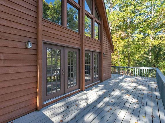 Fantastic A-frame home on low maintenance lot at Lake Monticello with 865 sq ft of decking! First floor opens to spacious great room with soaring ceilings, gleaming hardwood floors & a wall of windows overlooking lovely, wooded lot. Family rm opens to fantastic eat-in kitchen with custom wood ceilings. 2 sizable bedrooms & full bath on 1st level. 2nd floor features fantastic loft & private master suite with attached bath & walk-in closet. Finished lower level has even more living space with 4th bedroom, spacious rec room, third full bath & bonus room. Bonus room would be a great office, exercise room or just extra storage space! Many recent updates including HVAC, new double-hung windows & sliding doors, plumbing & paint! Close to gate.