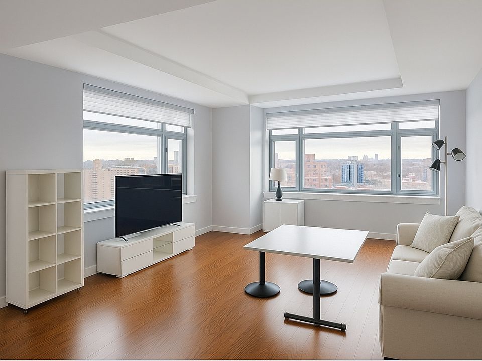Huge high floor corner 1br apartment at the highly desirable Skyview Parc Luxury condo complex in the heart of Flushing for rent.