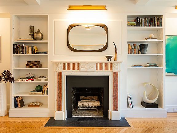 The formal entry foyer with Italian marble inlay floors gracefully separates the living room in one direction and the formal dining room and kitchen in the other. The gracious living room is bathed in beautiful natural light with the oversized north facing windows offering stunning open city views highlighted by the breathtaking First Presbyterian Church Spires and lower Fifth Ave...it is a chic sanctuary. The formal dining room is both stylish and graceful. It features a southern exposure, custom millwork and smartly concealed 7' tall SubZero wine storage. It is the perfect place for grand scale entertaining or cozy & quiet family time and meals. Directly off of the dining room is the windowed Chef’s kitchen which is classically designed with quartzite polished countertops, a farm sink, custom cabinetry and SubZero, Miele and Viking appliances.