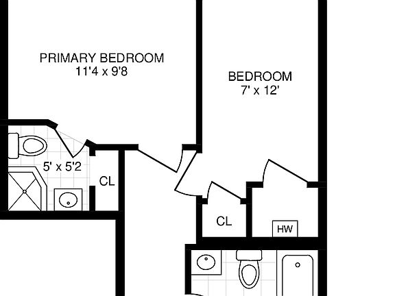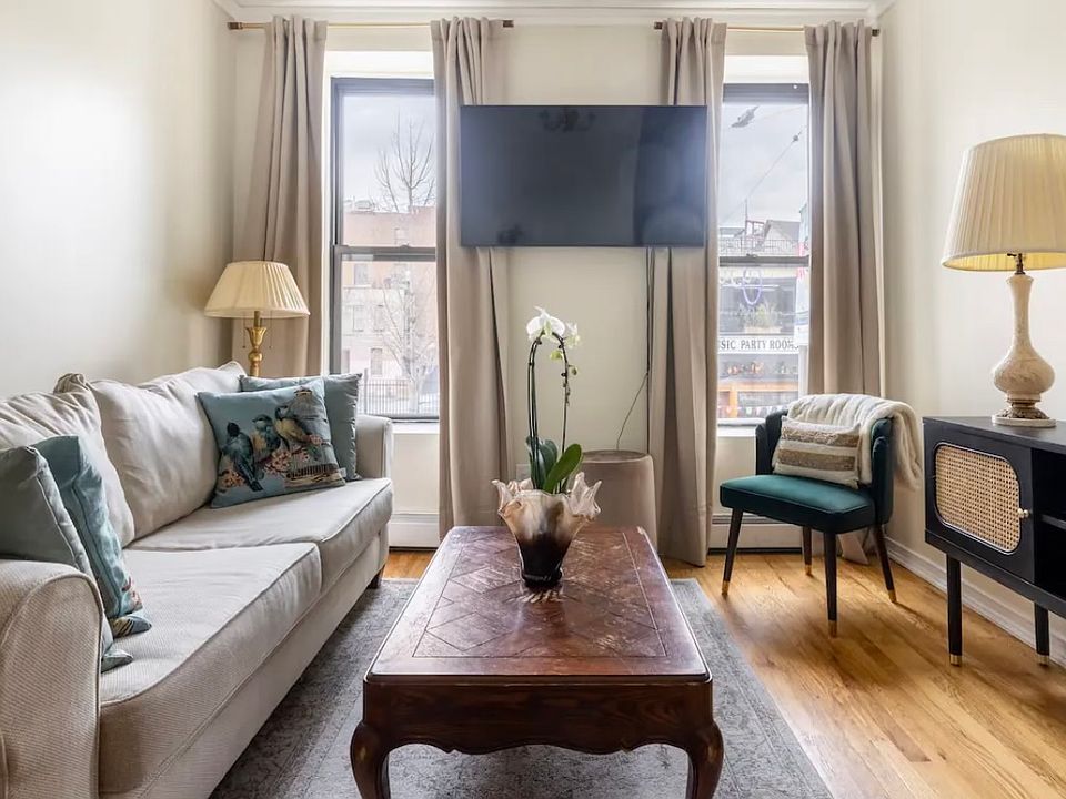 This apartment boasts high ceilings and large windows. The living area is large enough for a living space, a dining area, and a workstation. The primary bedroom can fit a king bed and includes an ensuite bathroom with shower and access to the large private roof deck. The other 2 bedrooms can both fit a queen bed. The classic hallway bathroom has a tub/shower combination and a vanity with storage. The compact kitchen contains full size appliances and includes an exhaust fan.