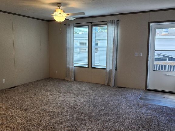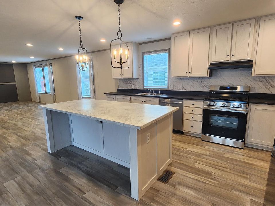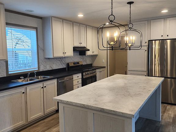 Gorgeous Brand New manufactured 3 bed 2 bath home. Kitchen comes with black stove, fridge and dishwasher package along with tons of cabinet space, MASSIVE seated island with upgraded lights. Multiple spacious living areas, with ceiling fans. Both bathrooms have upgraded sinks and tubs. Home is set against the woods giving you a gorgeous view of nature and much more. This is a beautiful home that will not last long.