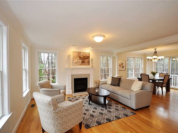 Stately Colonial tucked back in the sought after the Revolutionary Ridge neighborhood. Private lot surrounded by mature trees with peaceful views of nature. Granite gas kitchen including a breakfast bar opens to dining room full of natural light with glass sliders to access the exterior. Pillared entry to the formal living room graciously appointed with dental molding and a gas fireplace. Breathtaking expansive family room with gleaming hardwood and incredible windows. Private Master Suite on the second floor furnished with a walk-in closet and en-suite bath. Bright laundry room on second floor with utility sink and cabinets for storage. A few steps up is another bedroom along with a third floor family bath and two more bedrooms. Excellent storage on the unfinished lower level, framed and roughed for a lower level bath. Peaceful neighborhood, exceptionally maintained home feels like a new construction!