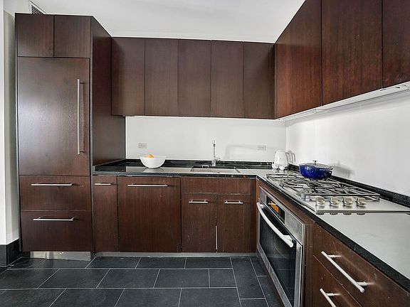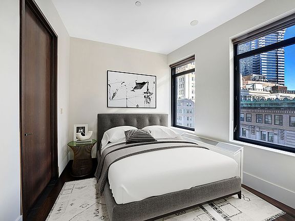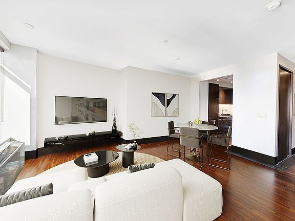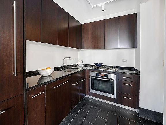 Welcome home to this stunning 824 square foot 1 bedroom, 1.5 bath sanctuary. With 10-foot ceilings and oversized windows capturing brilliant natural light from the East exposure, this apartment exudes a sense of airy spaciousness. Beautiful Brazilian Walnut floors throughout are adorned with Basalto black granite borders.