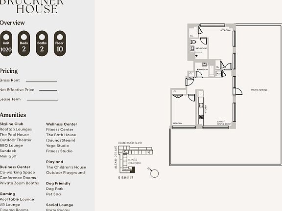 Huge Private Terrace! Two Bedroom homes at Bruckner House offer luxury finishes, modern appliances, and abundant natural light. Selected units have island kitchens, creating a stylish, practical living space.