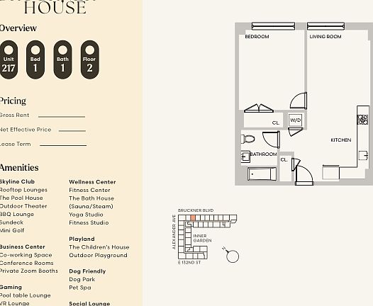 - Exterior features: , Bicycle storage, Broker Exclusive, Childrens Playroom, Courtyard, Garden, Live In Super, Media Room, Nyc Evacuation 4, Package Receiving, Parking, Recreation Facilities, Roof Rights, Roofdeck, View Type: Garden View, View Type: Skyline View, Waterview