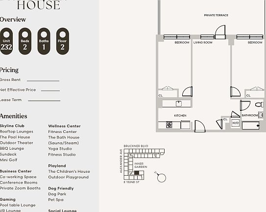 - Exterior features: , Balcony, Bicycle storage, Broker Exclusive, Childrens Playroom, Courtyard, Garden, Live In Super, Media Room, Nyc Evacuation 4, Package Receiving, Parking, Recreation Facilities, Roof Rights, Roofdeck, Terrace, View Type: Garden View, View Type: Skyline View, Waterview