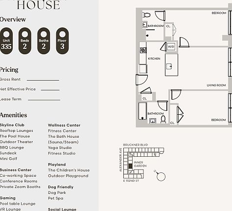 - Exterior features: , Bicycle storage, Broker Exclusive, Childrens Playroom, Courtyard, Garden, Live In Super, Media Room, Nyc Evacuation 4, Package Receiving, Parking, Recreation Facilities, Roof Rights, Roofdeck, View Type: Garden View, View Type: Skyline View, Waterview