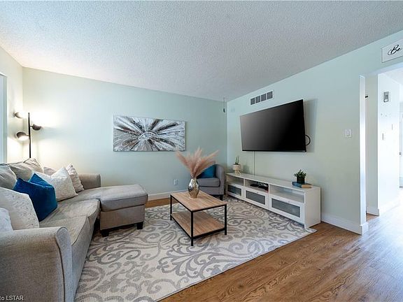 Welcome to this immaculate end-unit townhouse-style condo, nestled in a quiet East London neighborhood. This clean, bright home boasts upgraded floors and fresh paint throughout, providing a modern and inviting atmosphere. The main floor features a spacious living room with a large window that floods the space with natural light. The eat-in kitchen, complete with a dining area, opens to a private back patio. A convenient two-piece bathroom, that was renovated on 2020 is also located on the main floor. Upstairs, you'll find a generously sized primary bedroom, along with two additional bedrooms and an updated four-piece main bath (also 2020), offering ample space for family and guests. The lower level is partially finished, presenting a large family room with a cozy gas fireplace, ideal for entertaining or unwinding. The basement also houses the laundry area, adding to the home's functionality. Enjoy the peace and tranquility of this desirable location, while being close to all the amenities East London has to offer. Don't miss out on this move-in-ready gem!