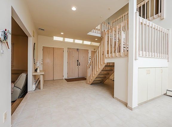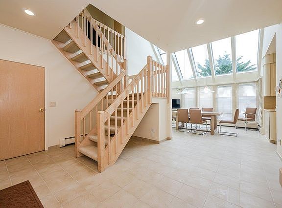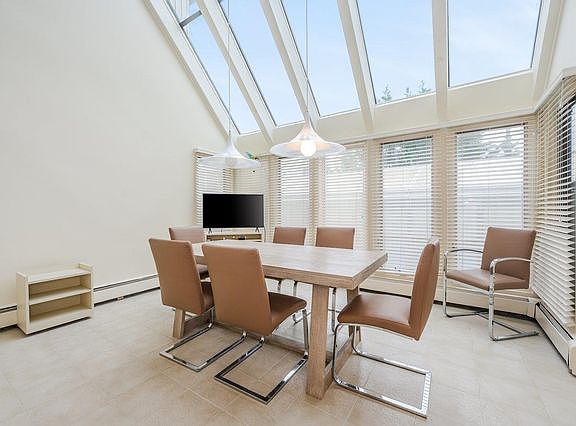 Walk-in closetsSpacious primary suiteOffice and a deckDining area with skylights