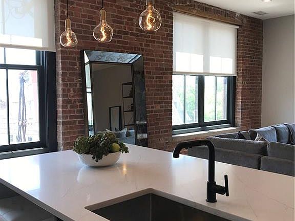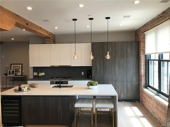 Stunning two-bedroom, two bath condominium combines the aesthetic of a former factory/printing house with exposed, pipes, bricks and beams and the refined luxury of a modern loft. Highlights include wide-plank white oak flooring, 10' ceilings, flame ash wood custom kitchen cabinetry, basaltina stone countertop and backsplash, waterfall Aurea quartz kitchen island and Bosch appliances/Thermador refrigerator. Master bath features dual seamlessly integrated sinks w/Atlas Quartz surface countertop and a feature wall of Aurea Quartz slab w/niche accent lighting & concealed drain. Fully designed to accommodate motorized window shades, home automation & AV systems. Energy efficient hydro air heating & air conditioning w/Navien high efficiency boiler. Oversized Marvin windows. Square recessed LED lighting throughout. In the heart of Dobbs Ferry and steps from train & 35 mins to NYC via metro north. Amenities include state of the art fitness center and rooftop deck.