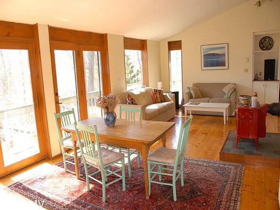 Contemporary West Tisbury hideaway in Christiantown area. This three-bedroom, two and a half bath home is bright and open with sliding glass doors connecting every room to the lovely outdoor spaces. High ceilings, pine floors, air conditioning and passive solar heat add to the appeal of this privately situated island home in a highly desirable central location. The large deck and expansive yard overlook a lovely pond on the property.