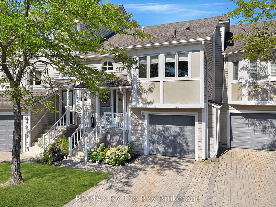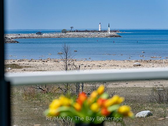 Experience waterfront living at Cranberry Surf, one of Collingwood's most sought-after lifestyle communities. This beautifully renovated townhome offers breathtaking, unobstructed views of Georgian Bay, showcasing the iconic Nottawasaga Lighthouse, the ski hills of Blue Mountain, and stunning sunsets from your living room and all three bedrooms. Designed for effortless luxury, this home boasts an open-concept layout with the primary bedroom conveniently located on the main level. The inviting foyer welcomes you with ample storage, a stylish 2-piece powder room, and direct access from lower landing to private garage. The main living space is bathed in natural light, featuring vinyl plank flooring, crown moulding, and a private balcony overlooking the bay. The chef's kitchen is complete with custom cabinetry, quartz countertops, and premium stainless-steel appliances. The primary suite is a serene retreat with its own walkout balcony, a spacious walk-in closet, and a 4-piece ensuite with a custom glass shower and double vanity. The lower level offers two additional well-appointed bedrooms, including a guest suite with a walkout to a covered patio. The semi-ensuite bathroom exudes elegance, featuring heated flooring for year-round comfort. A full laundry/utility room and an expansive crawl space provide ample storage solutions. Situated directly on Collingwood's waterfront trail system, this home offers unparalleled access to four-season outdoor recreation, and the opportunity to rent the home seasonally to cover expenses or investment income. Minutes to downtown boutiques, gourmet dining, golf courses, and world-class ski clubs. As a resident of Cranberry Surf, you'll enjoy exclusive access to a private outdoor pool with panoramic harbour views, as well as convenient visitor parking. This is a waterfront sanctuary designed for those who appreciate refined living and natural beauty. Don't miss this rare opportunity to own a piece of paradise overlooking Georgian Bay.