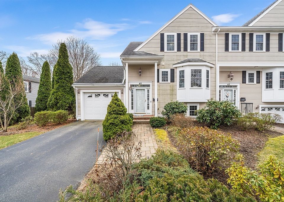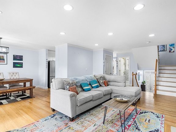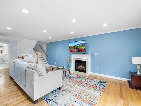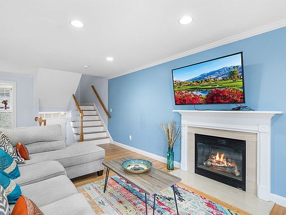 Beautiful Townhome featuring an open floor plan with a well-equipped kitchen including granite countertops and stainless steel appliances and a sunny sitting/eating area. The generous family room with gas fireplace and recessed lights is open to the dining room with updated lighting. Hardwood floors throughout the first and second floor. French doors to the deck lead to a large level backyard. Impressive Primary Suite complete with walk in closet and full bath. an additional bedroom and full bath with new glass shower enclosure complete the second floor. Fabulous lower level includes a Family Room/Home Theater Room with 4K compatible Projector, 5.1 sound system and Projection Screen. A generous 3rd bedroom, a Laundry Room and a Garage! Extended Driveway for additional parking. LOCATION, LOCATION! Steps away from Canton Center Commuter Rail Station, Restaurants, Shops and a short drive to Canton Junction Station (less than 1 mile), I-95, Rte 128 and Rte 1.