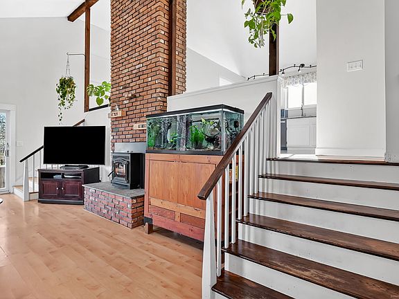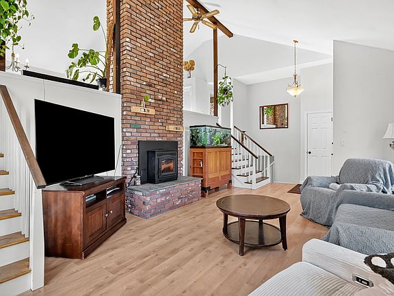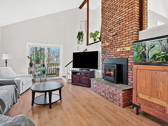 Open & Airy Multi-Level Home in a Picture-Perfect Neighborhood! Step inside this inviting, light-filled home featuring vaulted ceilings, multi-level living, and a dramatic floor to ceiling brick fireplace that creates an unforgettable focal point. The living room boasts a cozy pellet stove, perfect for keeping warm all winter, and flows effortlessly into the dining room and kitchen, creating an ideal layout for everyday living and entertaining. A charming side balcony offers the perfect spot to enjoy morning coffee and fresh air. The kitchen features freshly painted white cabinets with space for a dinette or island, while the dining room showcases wood-beam accents, views of the fireplace, and sliders leading to the deck-a great extension of your living space outdoors. On the main level, you'll find three bedrooms, including a primary suite with an updated private half bath. The main full bath has been tastefully updated with a tiled shower, a new vanity, and modern light fixtures. The lower walkout level offers additional living space, including a cozy family room with a whitewashed fireplace, a half bathroom combined with laundry, and convenient garage access. Outside, enjoy the spacious yard, perfect for play and relaxation-plus an upscale chicken coop ready for your feathered friends! Recent big-ticket updates include a brand-new furnace, new roof, and updated chimney for peace of mind. All in a setting that you will love coming home to!