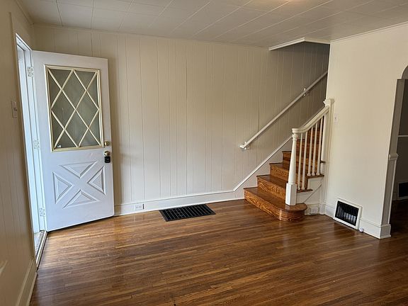 Check out this beautifully renovated three bedroom home offering covered front porch, fenced yard, stunning hardwood floors, large kitchen, full basement and CENTRAL A/C
