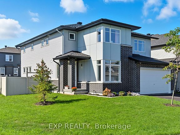 Welcome to this 2021 built Cardel Nichols Elevation A3, located in the sought-after Millers Crossing community of Carleton Place. Offering over 2,800 sqft of above-ground living space, this corner-lot property combines thoughtful design, extensive upgrades, and a prime location close to everyday amenities. The open-concept main floor features a chefs kitchen with stainless steel appliances, upgraded cabinetry, quartz countertops, undermount LED lighting, a walk-in pantry, and an oversized island with adjoining dining area. The kitchen flows seamlessly into the great room, highlighted by soaring 11 ceilings, sunlit floor-to-ceiling windows, and a sleek tiled gas fireplace with a modern mantel. Two large flex rooms, a mudroom, and a powder room add versatility and convenience on this level. Upstairs, the extended primary bedroom includes a walk-in closet and a luxurious 5-piece ensuite with private toilet enclosure. Three additional well-sized bedrooms, laundry room with custom cabinetry, and a full bathroom complete the second floor. This home showcases over $64,000 (before tax) in builder upgrades, including $32,000 in design enhancements such as upgraded hardwood flooring, premium carpeting, kitchen cabinetry, 8 interior doors, and quartz countertops throughout, along with $32,000 in structural upgrades including the premium corner lot, extended primary bedroom, and second flex room. The exterior offers a double-car garage with driveway space for 4 additional vehicles, a spacious fenced backyard (2023 @ ~$11,000), and close proximity to Millers Crossing Park just a 1-minute walk away. Everyday shopping is less than 5 minutes by car at Walmart Supercentre, Loblaws, and Home Depot, with quick access to Highway 7 and only 21 minutes to Kanata.