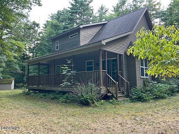 Reduced Pricing - 7.03 acres of wooded tranquility in this never before offered well maintained home. There is a stream along the front as you approach the home up a slight hill to a secluded clearing. Relax on the front porch the length of the home or on a matching porch off the back. You'll enter into a gas fireplaced great room with soaring ceilings combining with the open kitchen and dining area. There are 2 bedrooms and a full bath down a short hall and a dramatic staircase leading off the great room to another bedroom (primary) and full bath on the second floor. This home is very well maintained and used infrequently over the years and it shows. Septic system serviced in 2024. Heating system with recent annual service too. Don't miss this opportunity for a getaway in the Adirondacks.