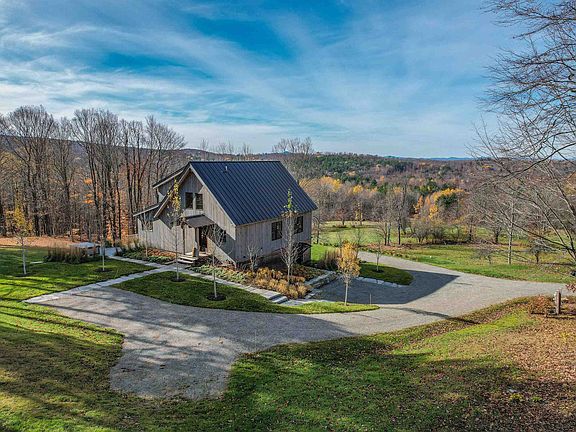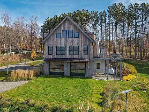 Newer custom-built home with gorgeous long-range mountain views, yet easy access to I-89 and commuting to Hanover/Dartmouth and the Boston area. The residence was architecturally designed and built to achieve that perfect blend of modern farmhouse simplicity with an aesthetic of light wood surfaces and beams, an open floorplan and walls of windows and light. The main living level features a gourmet kitchen, dining and living rooms plus a spacious mud/laundry/half-bath. Upstairs is the primary BR with vaulted ceilings and an ensuite BA, plus another BR with vaulted ceilings and a hall BA. The lower level has colored concrete floors, a full BR and hall BA, a TV lounge area, and 2 bays of attached, heated, finished garage space, 1 of which is presently used as a painting studio. The landscaping - designed by a professional landscape architect - is perfectly balanced to minimize gardening and lawn maintenance while surrounding the house with tall grasses, shrubs and a very unique garage apron engineered from stamped concrete squares and grass. The main level opens to a wrap-around deck and hot tub that enjoy the 30-mile long-range mountain view. Radiant heat. All modern mechanicals. If you are looking for a clean, walk-in, walk-out house for easy living, easy access and walk-out-the-door-and-get-on-a-plane convenience, this is it. See the dedicated property website for high rez photos, a virtual walkthrough and additional information.