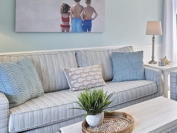 - Sleeps 6 guests in Primary bedroom (King bed), Secondary bedroom (Queen bed and Twin bunks), and Living Room (Queen Sofa bed).