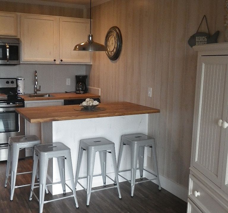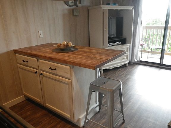 This unit was renovated with new flooring, paint and LED lighting throughout. The kitchen has been updated with new kitchen cabinets, butcher block countertops and tile backsplash as well as the addition of new stainless appliances and a dining peninsula. The bathroom was updated with a new vanity, toilet and all new decor. There are flat screen TVs in the living and bed rooms which are also furnished with new furniture, lamps, decor and ceiling fans. The truly unique addition to this unit are the bedroom and bathroom barn doors, this allows for a more spacious floorplan, not to mention how awesome they look. The villa balcony overlooks the marsh and provides a partial ocean view where you can enjoy your morning cup of coffee and listen to the birds or relax with a cold beverage at the end of a beach filled day. Free Wi-Fi is available throughout the complex. All of this is only a short walk (approximately 75-100 yards) to the beach, oceanfront pool, snowcone stand & beachfront bar! Unit in building C a few units from the elevator and overlooking the marsh.
