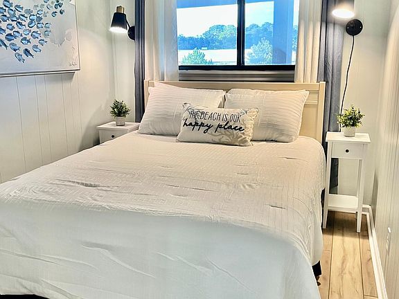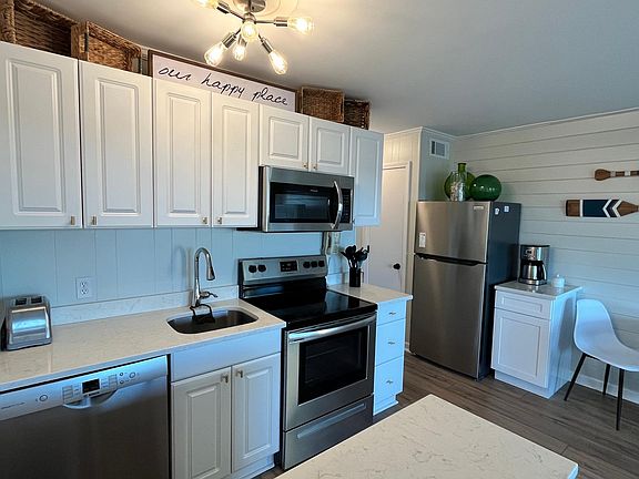 The bedroom has a queen size bed, TV, and full private bath. Living room with sleeper sofa, flat screen TV, dining area and free Wi-Fi. The kitchen is completely stocked with dishes, silverware, pots, pans, coffee maker, and all new stainless-steel appliances. Air conditioning, cable/satellite, and complimentary starter toiletries.