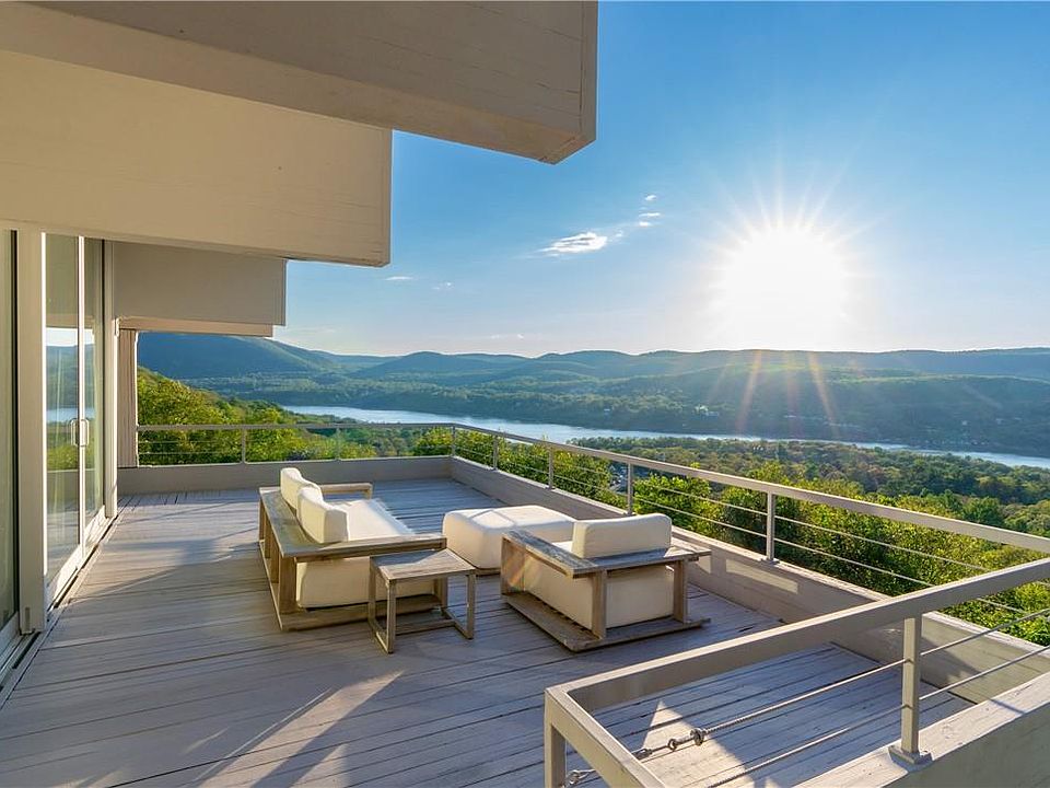 Luxury rooted in simplicity: an outstanding Madderlake-designed contemporary with 180 degree views of the Hudson River. Perched on 6 acres, high on a hill in Garrison, NY, the residence is revealed via a long scenic driveway that opens to magnificent Hudson River views and a landscaped front garden. Bathed in celestial golden light, the recently upgraded floor-to-ceiling, energy-efficient glass walls and doors and new wrap-around deck offer ever-changing sunsets year-round. With its 10 ft white-washed ceilings, mix of rich woods and polished concrete and epic indoor pool wing, this recently gut-renovated monument to minimalism is regularly used for a long list of celebrity and high fashion shoots.