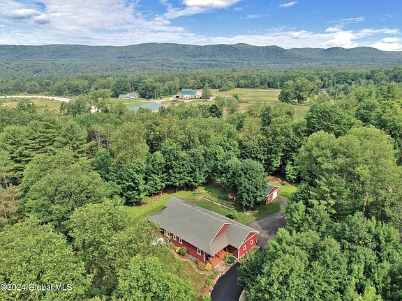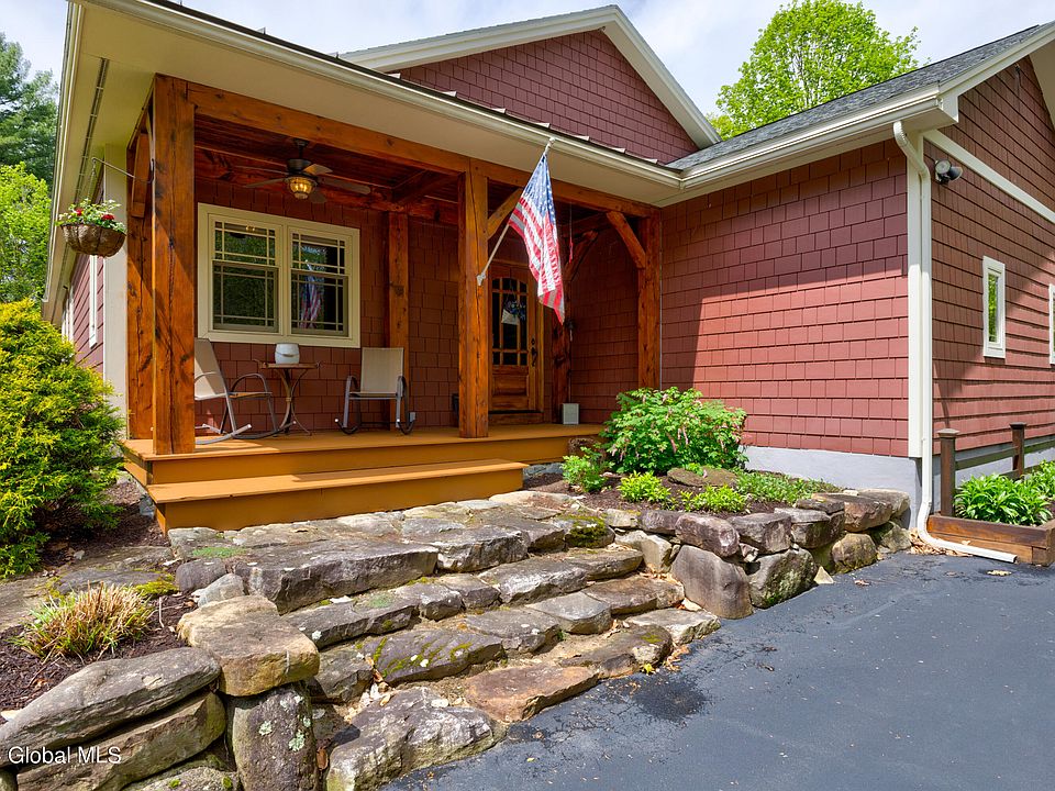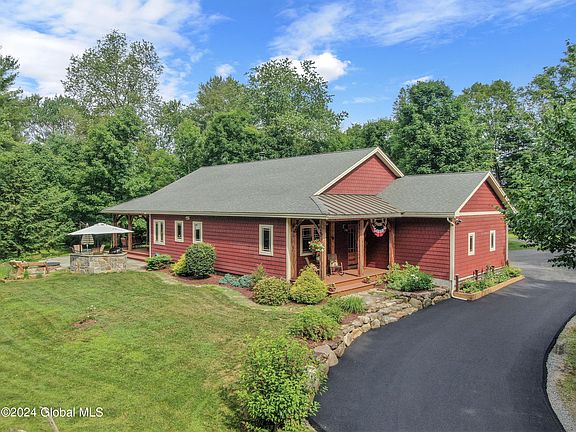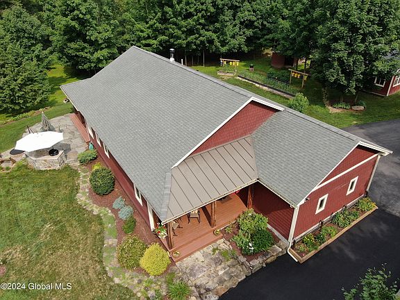 Welcome to your custom-designed post and beam retreat nestled on 2 acres.This property boasts a wrap-around porch, bluestone patio with outdoor cooking area featuring a Primo ceramic cooker, where culinary adventures await amidst the serene backdrop of stone walkways, stone walls and stunning perennial garden. Inside, the open floor plan with solid wood Hickory floors seamlessly integrates the dining area, great room, all centered around a custom-designed masonry heater crafted by a Finnish Master Mason. Revel in 24 hours of radiant heat. Radiant floor-heated 2-car garage, separate insulated garage, woodshed, and full basement offer convenience. Welcome home to single floor living, functionality, and sustainability. Listing Agent is owner