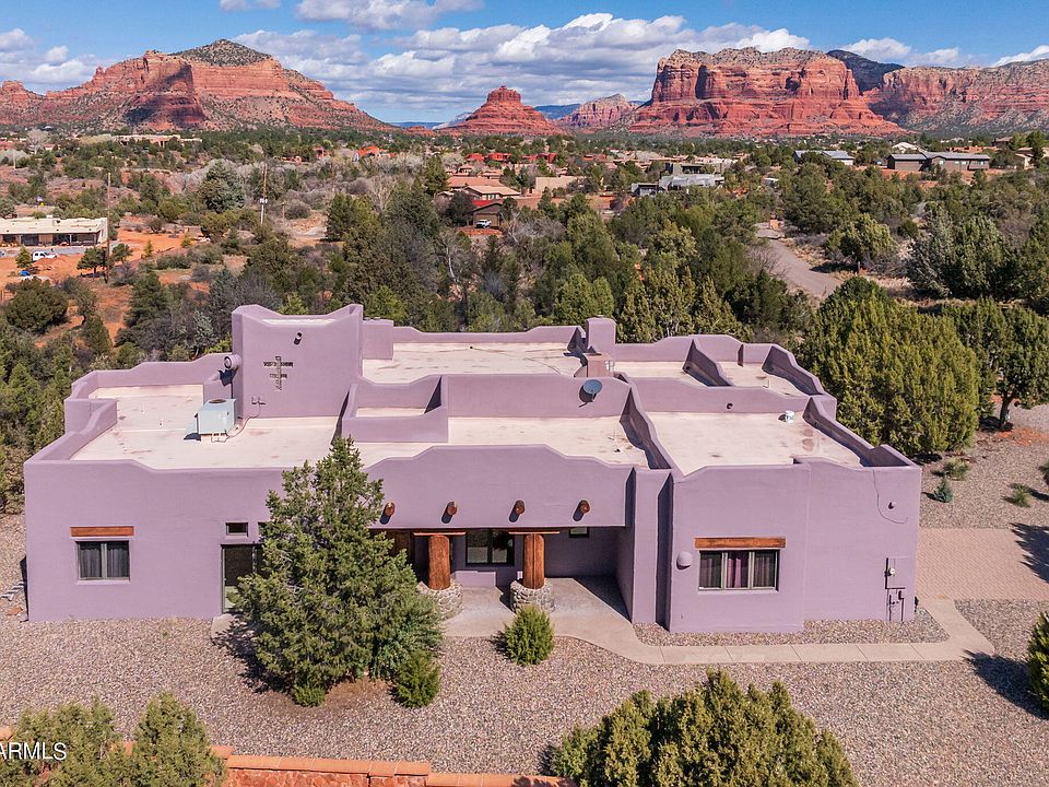 Beautiful, Move-in Ready 2930 Sq ft. Home on 1.07 Acres, situated on a 360 view lot. Gorgeous, jaw-dropping Views from All Angles to Enjoy the Breathtaking Sedona Sunrise & Sunsets, Majestic Red Rocks, Bell Rock & Natural Landscaping surrounding this One of a Kind Custom Built Home. A Serene Location with plenty of Hiking, Biking, Golfing, Shopping, Top Rated Restaurants within walking distance in the Village of Oak Creek. This home is a 3 Bedroom 3 Bath w/ Large Private Additional 4th Room that can be used as Bedroom, Office or Living space. There are Two-Primary Ensuite Bedrooms, each with their own Private access to Patio & Built in Fireplace. Soaring Wood Beam Ceilings in the Open living space with Ample Windows & Sliding Glass Doors, to Provide Stunning Views as you walk throughout
