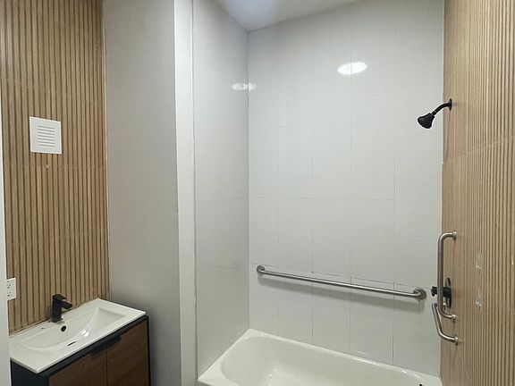 Modern kitchenFreshly renovated apartmentTrendy bathroomHardwood flooringSpacious living space