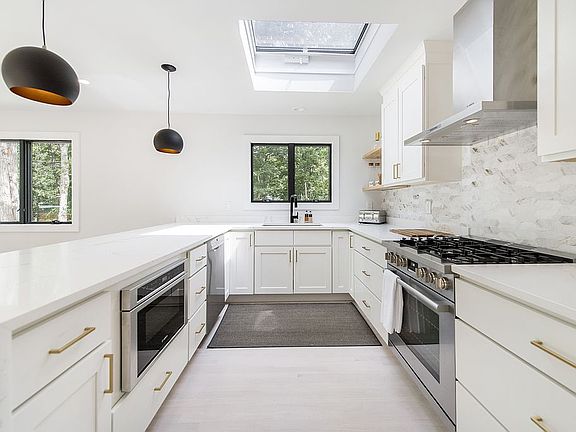 Welcome home to this gut-renovated, sundrenched, gorgeous three-bedroom home in East Hampton. Upon arrival, you are greeted by a long driveway leading to your new home set on almost 1 acre surrounded by trees and fresh landscape. The steel and glass front-door creates a grand-entrance that welcomes you into a double-height living room which has been masterfully updated to highlight the scale of the space, and sunlight that pours into the home throughout the day. Running throughout the main level are bleached oak floors, and oversized windows that create the perfect indoor-outdoor experience. Off the living space is a generously proportioned eat-in kitchen with all new Bosch appliances, a quartz countertop with waterfall edge, and access to the grand deck that runs the entire length of the home. Three well-appointed bedrooms allow for extra room to spread out, with a primary bedroom that features a large en-suite with double vanity and skylight. Situated on the opposite side of the home, the two secondary bedrooms provide ample room for all uses and are separated by the second bathroom. All bathrooms in the home are equipped with top-of-the-line Duravit toilets and Kohler fixtures that continue to complement the homes openness. The lower-level is currently configured with laundry, and a finished media room, with an extraordinary amount of space for many other uses including two extra bedrooms that are currently shown in permits that have been approved. The renovation also included a new hot water heater, and A/C unit. A picture-perfect yard awaits, with a generously sized pool that has been updated with a new liner, piping, and heater to ensure the house is ready to go the moment you move-in. The large deck spanning the entire length of the home allows for many uses and will lend itself perfectly to those looking to relax by day and entertain in the evening. Whether it be for casual weekends out East, or a primary residence, this home accommodates all. Don't miss the incredible opportunity to own such a stunning piece of property in prime East Hampton. *Option to expand with plans in place. Inquire for additional information!
