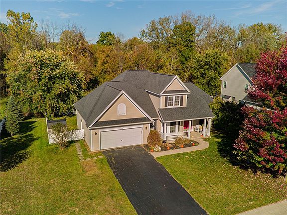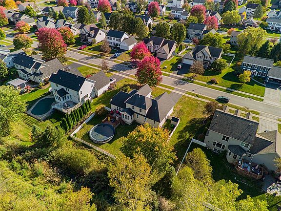 This Victor home has so much to offer! On this tree lined street you’ll find sidewalks, streetlights and this 4 bedroom /3 bath home that is a beautiful and contemporary mix of hardwoods and tile- new paint and carpet too! The FIRST FLOOR PRIMARY SUITE (we hope you’ll love the dramatic dark contrast wall!) has a double sized WALK IN CLOSET and its own FULL BATH with double sinks, plenty of storage and even a pampering WATERFALL SHOWER HEAD! The kitchen comes complete with all appliances- quartz counters and an adjacent FIRST FLOOR laundry room! There’s a FORMAL DINING ROOM just the perfect size for entertaining and a nearby half bath. The front office space (has double doors to close off for privacy) and can also be used as a family room or even a kids play space! Upstairs there are three more bedrooms- a full bath and an oversized linen closet! Moving downstairs to the rear of the home you’ll find the GATHERING ROOM that opens to the kitchen- this room has vaulted ceiling as well- a shelf ceiling too! (fun to decorate!)and a fireplace for those cozy nights! There’s a great view here of the deck (enjoy a quiet morning beverage in this private space) that opens to the ABOVE GROUND POOL (newer liner and filter!) It all backs to Victor Municipal Park that has a multi-age playground, enclosed lodge, picnic shelter, outdoor fitness stations, sand volleyball court, bocce ball court, and nature trails too! Showings delayed until 10am - 10/19 (due to a wedding!) and offers reviewed 10/28 after 6pm
