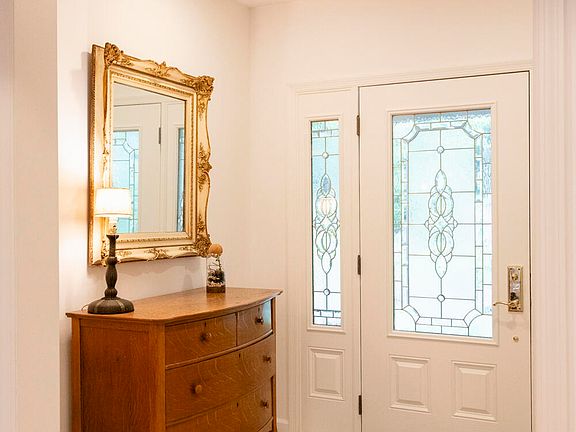 A welcoming covered front bluestone porch sets the tone as you enter into an open, airy floor plan that exudes warmth and thoughtful design. The entryway features a coat closet and a convenient half bath before leading into the expansive living, dining, and kitchen area. Oak floors, coffered ceilings, well-planned lighting, and a gas fireplace flanked by custom built-in bookshelves offer both elegance and comfort. The gourmet kitchen is a chef's dream, with granite countertops, stainless steel appliances, cherry cabinetry, and a spacious walk-in pantry—ideal for culinary enthusiasts.
