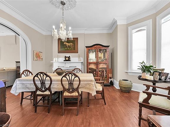 Victorian Beauty Restored . Step into the magic of this fully restored historic home, where timeless character meets modern comfort. Rich in detail, you’ll find grand ceilings, intricate cove moldings, original trim, and hardwood floors throughout. The welcoming foyer showcases the original stained-glass front doors, a sparkling crystal chandelier, and a sweeping staircase with the original 1846 Indenture Land Deed proudly displayed. From here, enter the elegant dining room, complete with a stately stone fireplace mantel, bay windows, and a striking chandelier. Tall, rounded pocket doors lead you into the great room, highlighted by wide baseboards, deep crown moldings, and classic hardwood flooring. When it’s time to unwind, the oversized main bath offers heated tile floors, a clawfoot soaker tub, and a double glass rain shower. All bedrooms are generously sized, and you’ll love the convenience of upstairs laundry. This home has been thoughtfully updated with a newer furnace and A/C, shingles replaced in 2014, updated electrical and plumbing, a new copper water line, Leaf Guard on the back eavestrough, and upgraded attic insulation. In 2023, a custom two-tier interlock patio was added, creating the perfect outdoor space within the fully fenced yard, complete with a storage shed and private parking for five. Best of all, you’re only steps to Locke Street’s trendy shops and just minutes to Hess Village. This is more than a house—it’s a warm, inviting piece of history you’ll treasure for years to come. Book your private showing today!