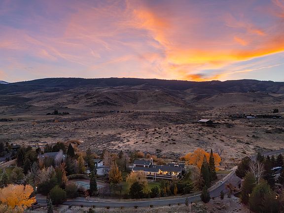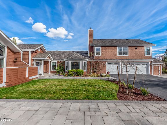 Discover a peaceful retreat on 2.97 acres in South Suburban Reno, set at the end of a quiet cul-de-sac and bordered by the Steamboat Ditch. Mature landscaping, tall trees, and wide-open grounds create a private, park-like setting ideal for outdoor living, gardening, and recreation. A long, tree-lined driveway—finished with a combination of asphalt and pavers—leads to the residence and includes an additional parking pad. Car enthusiasts and hobbyists will appreciate the 720 sq. ft. detached garage with 8-foot and 10-foot doors, along with an attached three-car garage providing abundant parking and storage. Inside, the home blends modern updates with warm architectural character. The great room features vaulted ceilings with exposed beams, expansive windows that frame the surrounding landscape, and a full stone wall with a wood-burning fireplace that adds texture and presence. Natural light fills the space, creating a bright and inviting environment. The updated kitchen offers granite countertops, stainless steel appliances, a spacious center island with seating, and an easy transition to the dining area. A second wood-burning fireplace adds warmth and gives the kitchen and dining space a relaxed, welcoming feel. Hardwood flooring through the main living areas enhances the home's clean and timeless appeal. A large recreation room offers extraordinary flexibility. With its generous dimensions, natural light, and full bath, it works beautifully as a game room, studio, home office, fitness space, or additional guest accommodations when needed. Indoor-outdoor living is effortless. An expansive enclosed patio extends the living area and is comfortable year-round. The property also includes a fenced garden with established beds, perfect for those who enjoy growing vegetables, flowers, or herbs. With nearly three acres of usable land, this setting offers room for future amenities, outdoor projects, or simply enjoying the peace and privacy. All of this is located just minutes from South Reno conveniences, schools, and shopping. A rare opportunity to own an updated home with substantial land, garage capacity, and flexible living spaces in one of Reno's most desirable suburban settings.