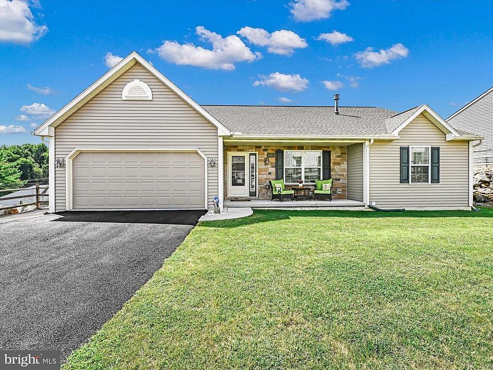 One floor living at its finest in this 3BR/2BA ranch home in Blue Mountain School District. Set back on a nicely sized .34 acre lot with plenty of parking, you will be immediately impressed with the vinyl/stone facade and welcoming front porch. The interior space includes beautifully vaulted ceilings in both the living/great room and owner's suite, spacious rooms, and extensive tile flooring in the foyer, walkway, kitchen, and all baths. The kitchen is a cook's delight with custom handmade all-wood cabinetry, prep island, and open dining area. The owner's suite with private bath and walk-in closet is smartly positioned on one side of the home with the guest bedrooms and guest bath on the other side. At five years young, this almost new home has all the amenities you can ask for including central air, first floor laundry, two-car garage, green space, rear deck, and a huge full basement to accommodate all your storage needs or can be finished for additional living space. No HOA fees. Showings to start Saturday, August 7th.