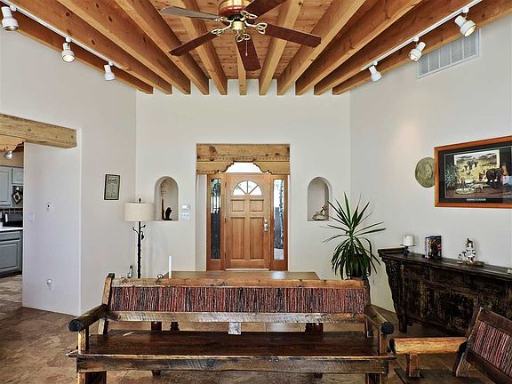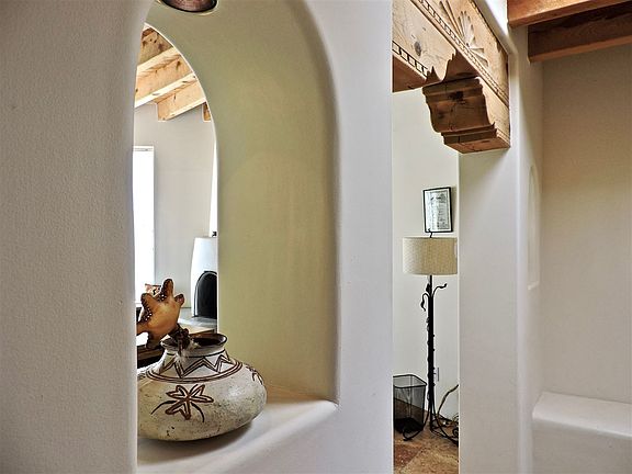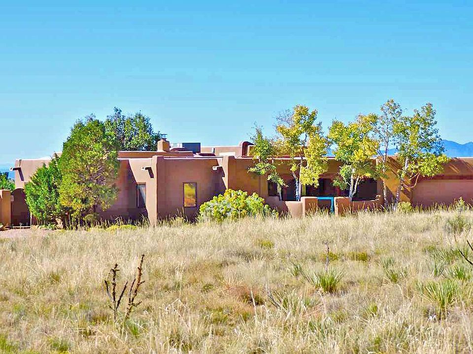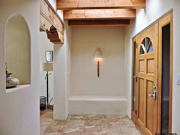 Bright and light contemporary pueblo design all the charm and character of Santa Fe yet clean lines refreshing to the eye. High ceilings and tons of south facing glazing creates a lofty feel and adds passive solar winter heat for energy efficiency. An updated radiant heating plus new boiler in 2014. Whole house filter Kinetico water softener and reverse osmosis added 2014. A new TPI roof plus a Gaco silicone roof was added with transferable warranty. New skylights and a newly ducted air conditioning/heating system installed on the roof-radiant heating system is Entran II, Seller has not had any issues with the radiant system to date. A lovely shaded courtyard entry, plus walled private rear garden and sunset views flagstone patio. A large heated 2 car finished garage with a new garage door opener and even guest parking! This home is located close to local shopping, Eldorado amenities and easy drive into Santa Fe. A must see!