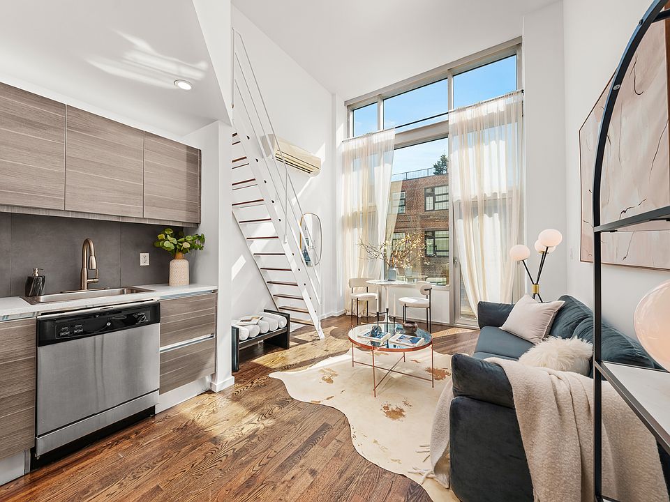 This beautiful Lofted Studio features an open style kitchen, Massive living room, a balcony, epic large windows, Glossy hardwood floors throughout the apartment, dishwasher, granite counter tops, and stainless steel appliances, high ceilings, central AC, and a deep soaking tub.